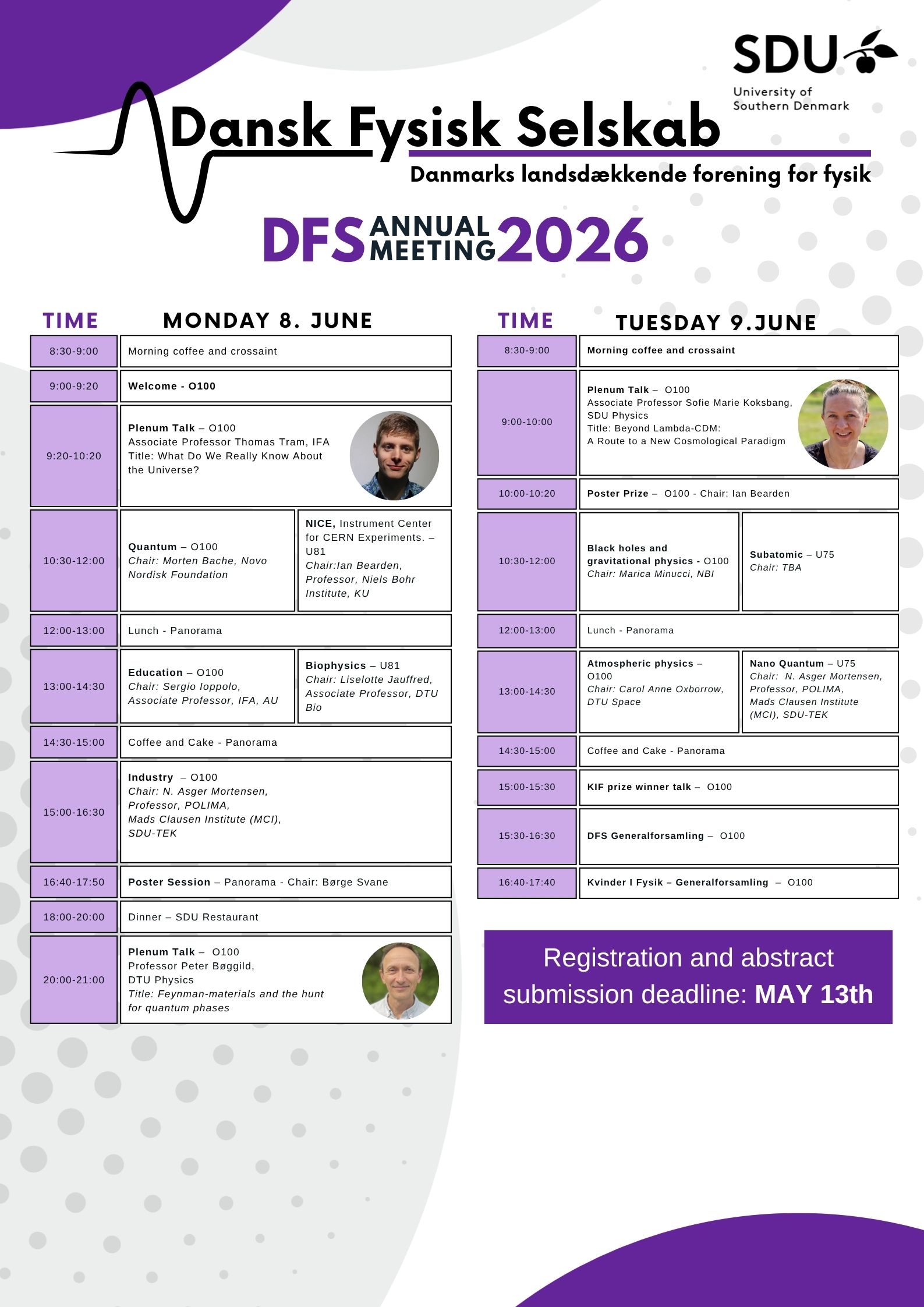 Hosting a session as chair is an amazing opportunity for young researchers, establishing their impact within a field with a mini-seminar of 90 minutes. All members of DFS are encouraged to chair a session. If interested, please contact mail@danskfysiskselskab.dk.